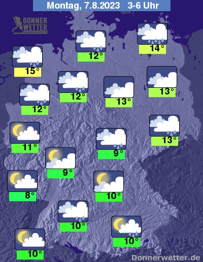 In der Nacht ist es vom Südwesten bis in den Westen Deutschlands oft locker bewölkt oder sternenklar und dazu trocken. Im übrigen Land halten sich hingegen meist dichte Wolken und es fällt gebietsweise auch Regen. Im Nordwesten und in Küstennähe bilden sich teils kräftige Schauer, vereinzelt auch Gewitter. Die Temperatur sinkt auf 15 Grad an der Nordsee und bis 8 Grad im Saargau.
