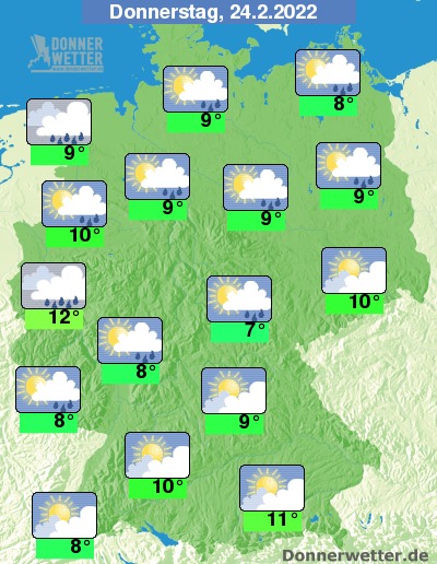 Am Donnerstag zeigt sich vor allem im Süden und Osten noch oft die Sonne, sonst ist es zunehmend bewölkt und nur zunächst trocken. Am Nachmittag zieht im Westen und Norden dann Regen auf. Die Temperatur steigt auf 7 Grad im Eichsfeld und bis 12 Grad in der Kölner Bucht. Im Norden weht ein zunehmend starker, teils auch stürmischer Wind. An der See herrscht zum Teil Sturm.