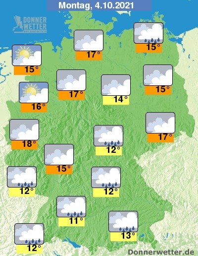 Am Montag bleibt der Tag überwiegend stark bewölkt oder bedeckt, dabei fällt vor allem im Süden, aber auch über der übrigen Südhälfte des Landes gebietsweise Regen. Im übrigen Bundesgebiet bleibt es jedoch weitgehend trocken. Die Temperatur steigt auf 11 Grad in Schwaben und bis 18 Grad im Rheinland.