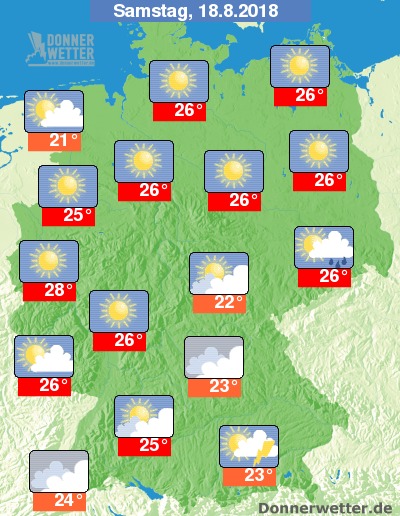 Am Samstag bilden sich vom Alpenrand, über Bayern bis zum Erzgebirge hier und da Schauer und örtlich auch Gewitter, dazwischen ist auch etwas Sonne möglich. Im übrigen Land ist es meist sonnig oder es ziehen lediglich lockere Wolken durch, dabei bleibt es trocken. Die Temperatur steigt auf 21 Grad in Bremerhaven und bis 28 Grad in Düsseldorf.