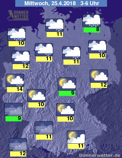 In der folgenden Nacht fällt über dem Norden bei dichter Bewölkung immer wieder und zum Teil auch kräftiger Regen. Im Süden zeigt sich der Himmel größtenteils sternenklar, sonst ist es teils locker, teils aufgelockert, hier und da auch stark bewölkt, jedoch weitgehend trocken. Die Temperatur sinkt auf 14 Grad in Düsseldorf und bis 8 Grad in Stralsund.