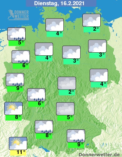 Am Dienstag bleibt es im Westen und Südwesten teils stark, teils aufgelockert bewölkt, vereinzelt ist etwas Regen möglich. Im übrigen Bundesgebiet ist es verbreitet neblig-trüb oder bedeckt, dabei bleibt es weitgehend trocken. Die Temperatur steigt auf 2 Grad an der Müritz und bis 11 Grad im Oberrheingraben.