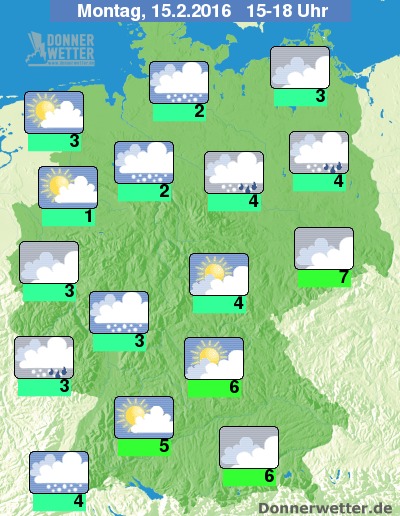 Im weiteren Tagesverlauf setzen sich zwischen Weser und Elbe sowie im Südwesten einzelne Schneeregen- und Schneeschauer fort. In den Mittelgebirgen sowie im Nordwesten des Landes gibt es einen meist trockenen Mix aus Sonne und Wolken, um 1 bis 7 Grad C.