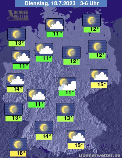 In der Nacht zum Dienstag zeigt sich der Himmel überwiegend sternenklar, hier und da zieht aber auch noch lockere bis wechselnde Bewölkung durch. Es bleibt trocken bei Tiefstwerten von 16 Grad in Freiburg und 11 Grad in Hamburg.