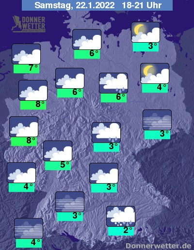 Heute Abend ist es im Süden bedeckt oder auch neblig-trüb, über Bayern fällt gebietsweise weiterer Schnee oder Regen. Im übrigen Land ist es dicht bewölkt, im Osten und Nordosten auch teils aufgelockert bewölkt, dazu fällt nur selten etwas Regen. Die Temperatur liegt bei 2 Grad in München und bis 8 Grad in Köln.