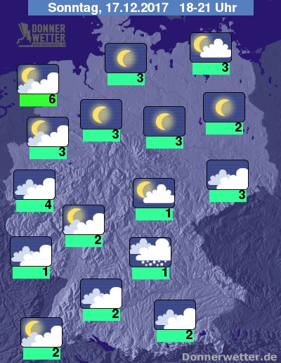 Heute Abend zeigt sich der Norden Deutschlands oft sternenklar, über der breiten Landesmitte ist es teils aufgelockert, teils stark bewölkt, jedoch weitgehend trocken. Der Süden bleibt zum Großteil wolkenverhangen, dabei fällt hier und da etwas Schnee. Die Temperatur liegt bei 1 bis 6 Grad.