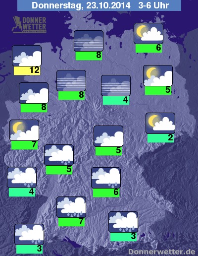 In der Nacht zum Donnerstag fällt vor allem im Süden und Südosten verbreitet anhaltender und teils kräftiger Regen, in höheren Lagen fällt teils kräftiger Schnee. In den anderen Landesteilen ist es teils stark, teils aufgelockert bewölkt und es fällt gelegentlich Regen. Stellenweise bildet sich zum Morgen hin Nebel. Der Wind weht im Süden und Südosten noch vielfach frisch bis stark, in Böen auch teils stürmisch, sonst weht meist nur noch schwacher bis mäßiger Wind. Die Temperatur sinkt auf 12 Grad direkt an der See und bis 2 Grad am Fuße des Erzgebirges.