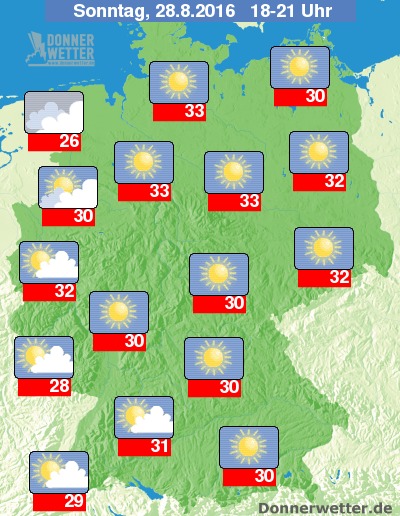Heute Nachmittag scheint über der Bundesrepublik verbreitet die Sonne und es ziehen nur selten wenige Wolken durch, dabei bleibt es trocken. Über Schleswig-Holstein und im Umfeld von Nord- und Ostsee sind jedoch vielerorts einige und zum Teil auch dichte Wolken möglich, dazu bilden sich hier und da auch Schauer oder lokale Gewitter. Die Temperatur steigt auf 26 Grad in Cuxhaven und bis etwa 32 Grad in Hannover.