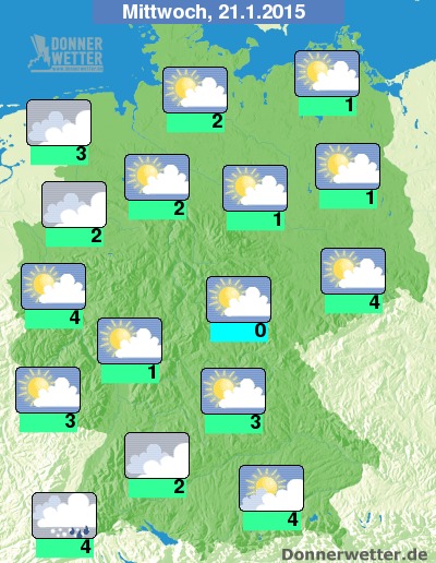 Heute kann sich neben gebietsweise dichten Wolken auch immer wieder mal die Sonne zeigen, meist dicht bleibt das Gewölk allerdings sowohl im Nordwesten als auch im Südwesten der Republik, dabei fällt aber nur selten mal etwas Regen oder Schnee, sonst bleibt es überall trocken. Die Temperatur steigt auf 0 Grad im Grabfeld und bis 4 Grad in Ostbayern.
