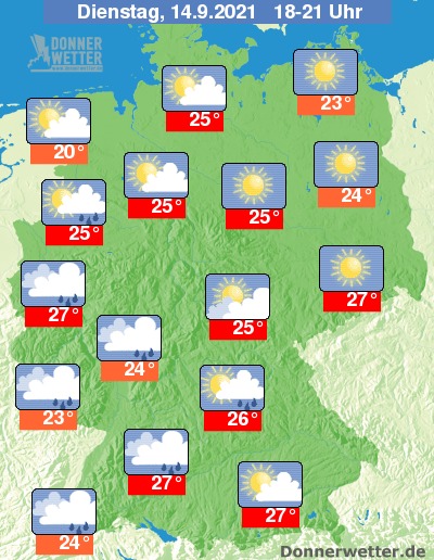 Heute Abend ist es nach Nordosten hin weiterhin sonnig und trocken. Über der Südwesthälfte ist der Himmel dagegen weitgehend wolkenverhangen und es bilden sich gebietsweise Schauer, lokal sind auch Gewitter möglich. Im übrigen Land ist es locker bis aufgelockert bewölkt und weitgehend trocken. Die Temperatur liegt bei 20 Grad in Cuxhaven und bis zu 27 Grad in München.