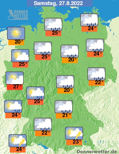 Am Samstag ist es überwiegend wechselnd bis stark bewölkt, im Osten und Süden bilden sich vielerorts Schauer und mögliche Gewitter, während es im übrigen Bundesgebiet größtenteils trocken bleibt. Nach Westen hin heitert der Himmel im Verlauf immer weiter auf. Die Temperatur steigt auf 20 Grad in Jena und bis 27 Grad in Bonn.