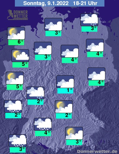 Heute Abend fällt im Ostseeumfeld und im Südwesten Deutschlands zeitweise Regen, Schneeregen oder Schnee. Im übrigen Bundesgebiet ist es ebenfalls meist dicht, hier und da aber auch aufgelockert bewölkt, dazu bleibt es trocken. Die Temperatur liegt bei 1 Grad in Jena und bis 6 Grad in Cuxhaven. Der Wind weht nur noch an der Nordsee zum Teil stark.