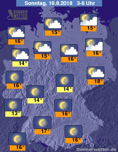 In der folgenden Nacht funkeln über der Südhälfte die Sterne von einem meist wolkenlosen Himmel. Über den Norden ziehen hingegen oft einige, meist jedoch nur lockere Wolkenfelder hinweg. Es bleibt überall trocken bei Tiefstwerten zwischen 18 Grad in der Lausitz und um 13 Grad im Saargau.