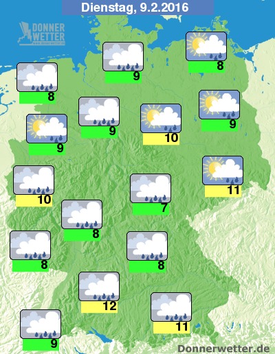 Heute bleibt es im Norden und Osten des Landes anfangs noch oft locker oder aufgelockert bewölkt und dazu auch trocken, weiter nach Südwesten hin ziehen dagegen bereits dichte Wolken durch und es fällt zum Teil kräftiger und auch langanhaltender Regen. Im Tagesverlauf zieht der Regen auch in den Norden und Osten Deutschlands. Die Temperatur steigt auf 7 Grad in Oberfranken und bis 12 Grad in Stuttgart. Es weht teils starker bis stürmsicher Wind.