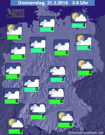 Am Donnerstag ist es im Süden überwiegend aufgelockert bis stark bewölkt und dazu trocken, über der breiten Mitte Deutschlands halten sich jedoch dichte Wolken und es fällt zeitweise Regen, im Norden zeigt sich der Himmel zwar stark bewölkt, jedoch bleibt es hier zumeist trocken. Die Temperatur steigt auf 10 Grad in Ostfriesland und bis 22 Grad in Augsburg.