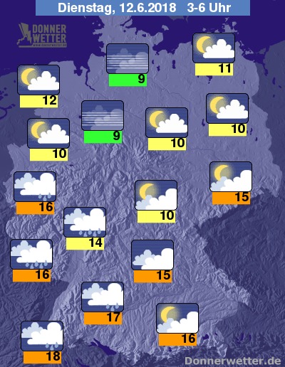 In der Nacht zum Dienstag ist es über der Nordhälfte des Landes meist locker, hier und da auch mal stärker bewölkt, aber trocken. Dichte Wolken halten sich dagen über dem Süden und Westen Deutschlands, hierbei bilden sich verbreitet auch Schauer und teils kräftige Gewitter. Die Temperatur sinkt auf 18 Grad in Freiburg und bis 9 Grad in der Norddeutschen Tiefebene.