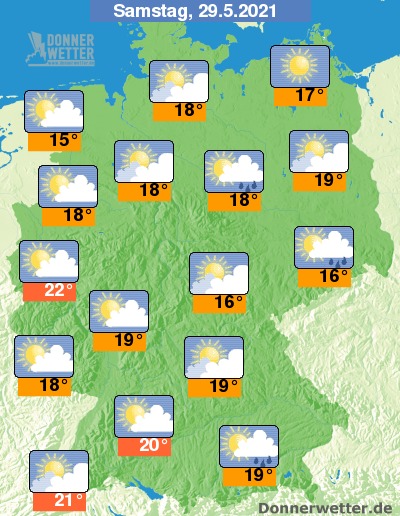 Am Samstag ist es verbreitet heiter, oft sogar sonnig, hier und da und besonders im Osten des Landes ziehen allerdings auch mehr und zum Teil dichte Wolken durch, dazu bilden sich hier vereinzelte Schauer. Im übrigen Land bleibt es hingegen weitgehend trocken bei Höchstwerten von 15 Grad in Wilhelmshaven und bis zu 22 Grad in Köln.
