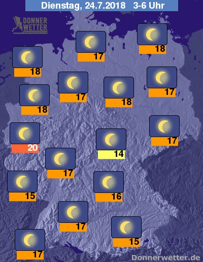 In der Nacht zum Dienstag zeigt sich das Land unter einem ausnahmslos sternenklaren Himmel, dazu bleibt es natürlich trocken. Die Temperatur sinkt auf tropische 20 Grad in Köln und bis etwa 14 Grad im Vogtland.