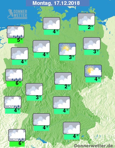 Am Montag zeigt sich das Wetter verbreitet trüb oder stark bewölkt, jedoch bleibt es größtenteils trocken, in den westlichsten Landesteilen fällt allerdings gebietsweise Regen, zum Teil auch Schneeregen. Die Temperatur steigt auf 2 Grad an der Müritz und bis 6 Grad am Rhein.