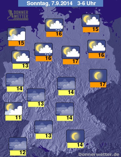 In der Nacht zum Sonntag klingen die Schauer und Gewitter weiter ab, zum Morgen hin kann es vor allem in Schleswig-Holstein zu weiteren Schauern und Gewittern kommen, sonst ist der Himmel aber verbreitet aufgelockert, besonders in der Südhälfte überwiegend gering bewölkt oder klar, dazu bleibt es trocken. Örtlich kann sich jedoch Nebel bilden. Die Temperatur sinkt auf 17 Grad im sächsischen Freiberg und 11 Grad im Bliesgau.