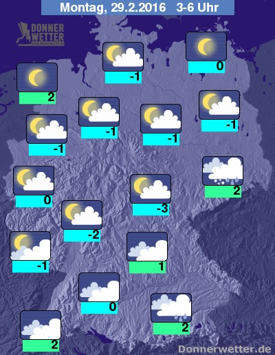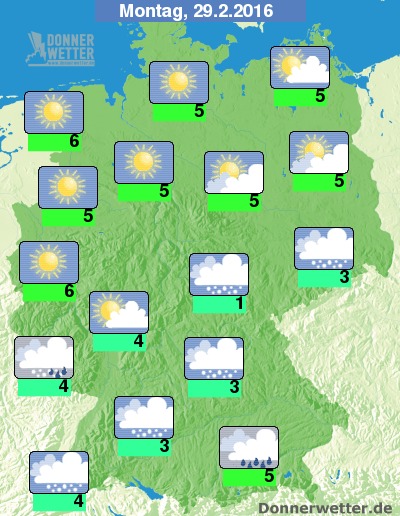 Am Montag bleibt es über der Südosthälfte überwiegend dicht bewölkt, dazu fällt immer wieder Schnee, Schneeregen oder Regen, nach Nordwesten zeigt sich der Himmel dagegen weitestgehend heiter bis sonnig und es bleibt zudem trocken. Die Temperatur steigt auf 1 Grad am Thüringer Wald und bis 6 Grad im Rheinland.