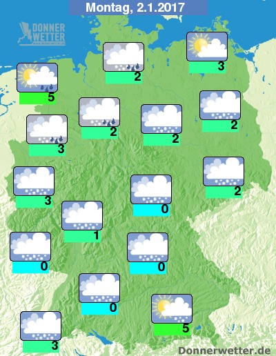 Die neue Wetterwoche beginnt nur im Süden anfangs noch freundlich, sonst erwartet uns dagegen verbreitet schon nasskaltes und meist stark bewölktes Wetter. Über weiten Landesteilen fällt dabei immer wieder Schnee, vor allem nach Westen und Nordwesten hin auch häufig Schneeregen oder Regen, der zum Teil noch gefriert. Es ist mit erheblicher Straßenglätte zu rechnen! Die Temperatur erreicht 0 bis 5 Grad.