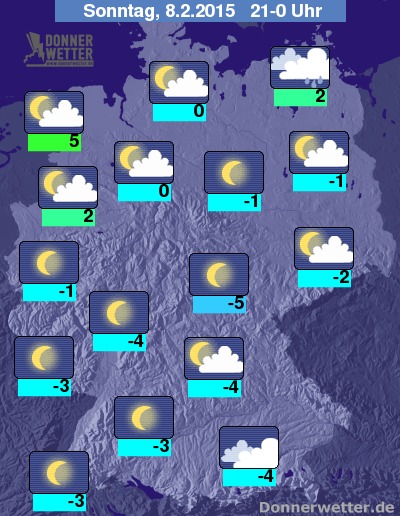 Heute Abend ist es von der Mitte bis nach Westdeutschland, sowie im Südwesten des Landes vielerorts sternenklar oder nur locker bewölkt. Im Süden und Osten ist es oft locker, gebietsweise aber auch stark bewölkt, dabei bleibt es meist trocken. Im Norden ist es anfangs noch meist leicht oder aufgelockert bewölkt, von der Nord- und Ostsee her nähern sich jedoch zunehmend dichtere Wolken und zum Teil kann es auch schon regnen. Die Abendtemperatur liegt bei 5 Grad im nördlichen Emsland und um -5 Grad im Grabfeld.