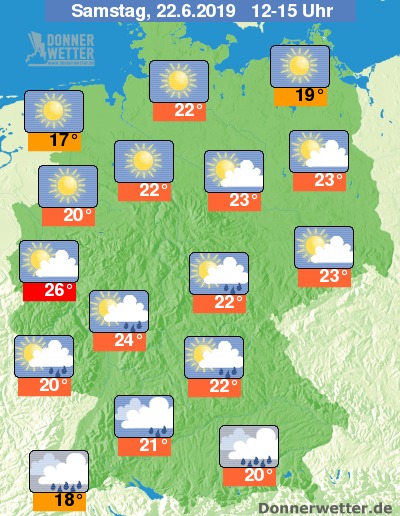 Heute Nachmittag ist es über der Nordhälfte des Landes heiter bis sonnig und trocken. Weiter nach Süden hin ist es hingegen teils aufgelockert, besonders im Alpenvorland ist es aber stark bewölkt und es bilden sich gebietsweise Schauer sowie örtlich auch Gewitter. Die Temperatur liegt bei 17 Grad an der Nordsee und etwa 26 Grad im Rheinland.
