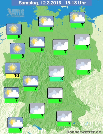 Am Sonntag im Norden und Westen oft heiter bis sonnig und trocken, sonst häufig stark, teils aufgelockert bewölkt und weitgehend trocken, 5 bis 10 Grad.