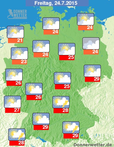 Heute ist es bis zum Mittag noch verbreitet heiter oder aufgelockert bewölkt, vor allem nach Osten hin auch gebietsweise sonnig, nach Norden und Westen hin teils aber auch schon stark bewölkt, jedoch trocken. Am Nachmittag nimmt die Bewölkung generell etwas zu, dabei sind im Süden und später auch in der Landesmitte bei teils kompakten Quellwolken gebietsweise kräftige Schauer und Gewitter möglich, sonst bleibt es hingegen weitgehend trocken. Die Temperatur steigt auf 21 Grad an der Nordseeküste und bis 29 Grad in Konstanz.