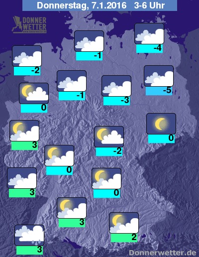 In der kommenden Nacht fällt vor allem im Alpenvorland noch zeitweise Regen, Schneeregen oder Schnee, dabei besteht Glättegefahr! Sonst klingen die Niederschläge jedoch verbreitet ab, vor allem im Norden bleibt es aber meist dicht bewölkt, in den anderen Landesteilen kann es hingegen auch oft auflockern. Die Temperatur sinkt auf 3 Grad im Saargau und etwa -5 Grad in Neubrandenburg. An der Nordsee weht teils starker Wind.