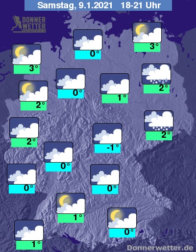In der Nacht zum Sonntag fällt über Sachsen unter dichten Wolken immer wieder Schnee. Im übrigen Land ist es teils stark, teils locker bis aufgelockert bewölkt, dazu bleibt es bis auf seltene Flocken trocken. Es bildet sich stellenweise Nebel bei Tiefstwerten von 2 Grad an der Nordseeküste und bis -8 Grad in Oberfranken.