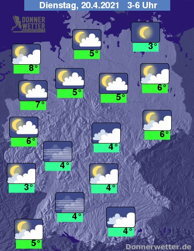In der kommenden Nacht ist der Himmel im Norden gering bewölkt oder sternenklar. Im übrigen Land ist es oft nur gering bis aufgelockert, vor allem über der Mitte des Landes, im Osten und Südosten auch stark bewölkt, dazu bleibt es weitgehend trocken. Die Temperatur sinkt auf 8 Grad in Wilhelmshaven und bis 3 Grad in Neubrandenburg.