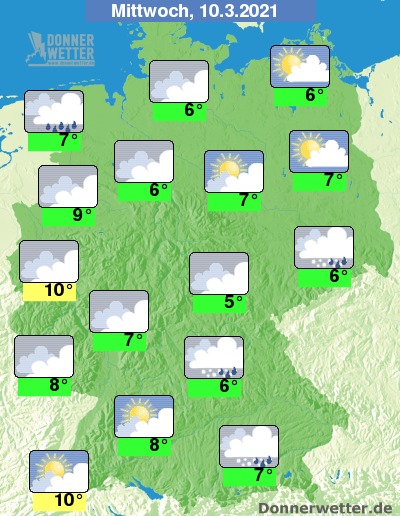 Am Mittwoch zeigt sich der Himmel östlich der Elbe sowie im Schwarzwald teils heiter, teils locker oder aufgelockert bewölkt. Sonst überwiegt starke Bewölkung oder der Himmel bleibt bedeckt. Im Südosten sind anfangs noch einzelne Niederschläge möglich, in der zweiten Tageshälfte zieht dann vom Emsland her neuer Regen auf, der sich ostwärts ausbreitet.