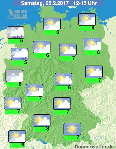 Heute zieht im Nordwesten dichte Bewölkung und nachfolgend Regen auf. Im weiteren Verlauf zieht es sich auch im Norden und Westen immer weiter zu, wobei es hier noch meist trocken bleibt. Über der Südosthälfte des Landes bleibt es hingegen vorerst meist locker bis wechselnd und dazu trocken. An der Nordsee weht ein teils stürmischer Wind. Die Temperatur liegt bei 5 Grad an der Nordsee und etwa 9 Grad im Oberrheingraben.