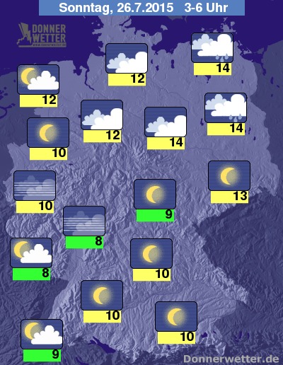 In der Nacht zum Sonntag halten sich im Norden meist dichte Wolken und es fällt auch noch teils kräftiger Regen, dazu weht hier ein starker bis stürmischer Wind mit möglichen Sturmböen. Im übrigen Bundesgebiet ist es hingegen verbreitet sternenklar oder es ziehen nur lockere Wolkenfelder durch, dabei bleibt es trocken. Im Osten weht noch ein teils starker Wind. Die Temperatur sinkt auf 14 Grad in Berlin und bis 8 Grad am Pfälzer Wald.
