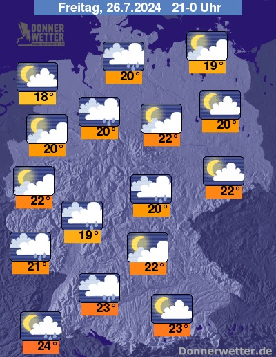 Am Freitagnachmittag zeigt sich der Himmel über dem Süden und Südosten des Landes heiter bis wolkig oder aufgelockert bewölkt, dabei bleibt es meist trocken. In den übrigen Landesteilen ist es am Nachmittag wechselnd oder stark bewölkt und vor allem im Westen und Nordwesten fällt zeitweise etwas Regen. Im Norden sind auch einzelne Gewitter möglich.