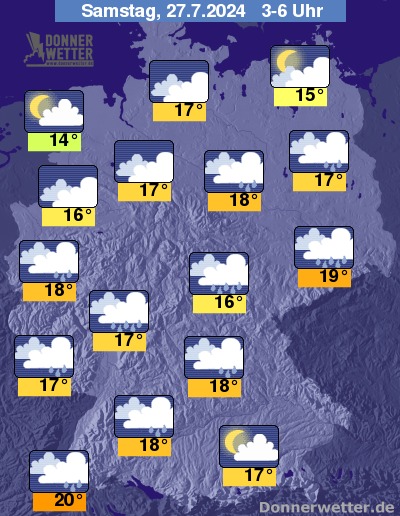 In der Nacht zum Samstag zeigt sich der Himmel verbreitet wechselnd oder stark bewölkt, dabei musst verbreitet mit teils schauerartig verstärktem Regen gerechnet werden; lokal sind auch Gewitter möglich. Überwiegend trocken bleibt es bei geringer Bewölkung im Küstenumfeld sowie im äußersten Süden.