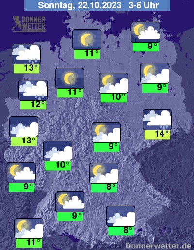 In der folgenden Nacht ist es zunächst meist wechselnd bis stark bewölkt, im Norden teils sternenklar, dazu bleibt es weitgehend trocken. In der zweiten Nachthälfte ziehen kompakte Wolken in den Nordwesten und Westen des Landes und es fällt nachfolgend gebietsweise Regen. Die Temperatur sinkt auf 14 Grad in Dresden und 8 Grad in München.