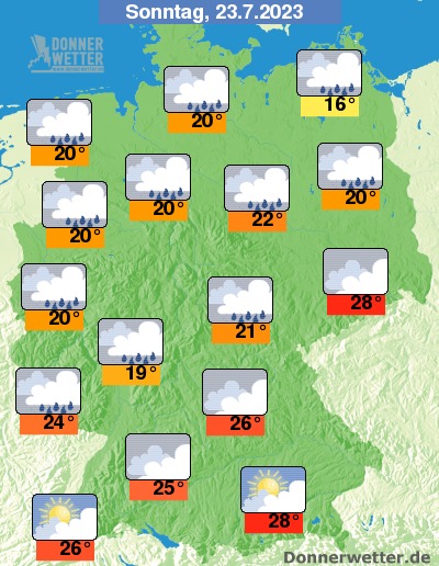 Am Sonntag ist es im Süden noch teilweise heiter, teils ziehen auch einige Wolken durch, aber es bleibt trocken. Im übrigen Land ziehen von Nordwesten her dichte Wolken auf und nachfolgend fällt zeitweise Regen. Die Temperatur steigt auf kühle 16 Grad in Rostock und bis 28 Grad in München.