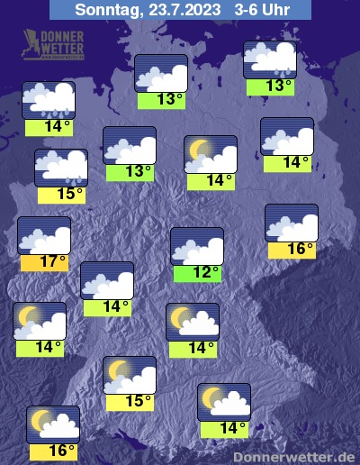 In der folgenden Nacht ist der Himmel im Süden oft locker bis wechselnd, in der breiten Landesmitte meist aufgelockert bis stark und im Norden verbreitet dicht bewölkt, hier zieht in der Nacht auch Regen durch. Im übrigen Land bleibt es trocken bei Tiefstwerten von 17 Grad in Köln und bis 12 Grad in Jena.