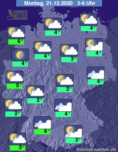 In der Nacht zum Montag klingen die Niederschläge auch im Nordosten ab, es bleibt vor allem im Osten, zunächst auch im Süden stark bewölkt. Im Westen ist es bereits meist locker bewölkt, oft auch sternenklar. In der zweiten Nachthälfte lockert und klart es auch im übrigen Land meist auf, dazu bleibt es trocken. Stellenweise bildet sich Nebel. Die Temperatur sinkt auf 6 Grad in Stuttgart und bis 2 Grad in Erfurt.