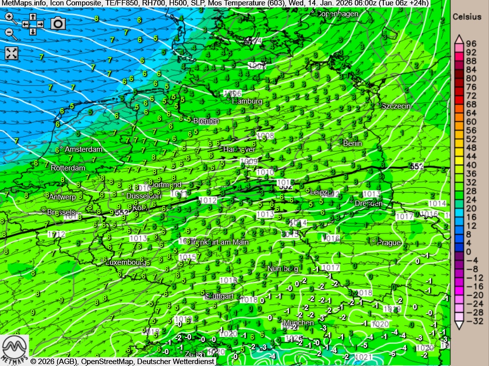 Die Strömungskarte mit Lufttemperaturen und die Wetterkarte für Mittwochfrüh (06:00 Uhr) sowie die 24-Stunden-Regenmengen für Mittwoch nach ICON: