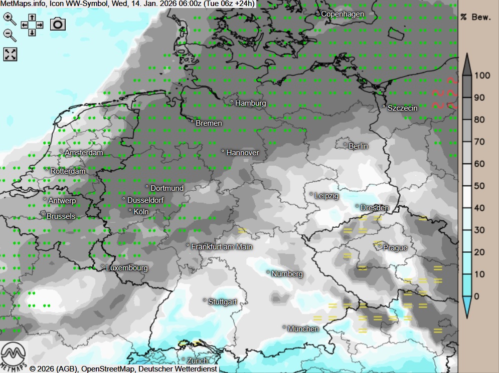 Am Mittwoch zeigt sich der Himmel über weiten Landesteilen stark bewölkt oder es ist nebelig-trüb, dabei fällt zeit- und gebietweise Regen. Im äußersten Süden - und später auch im Nordwesten - können die Wolken auch auflockern und es bleibt weitgehend niederschlagsfrei.
