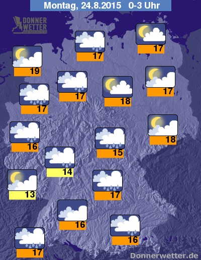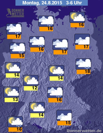 Im weiteren Nachtverlauf breiten sich die Regengebiete dann auf die mittleren und nördlichen Landesteile aus. Allein im äußersten Nordsten bleibt es überwiegend trocken.