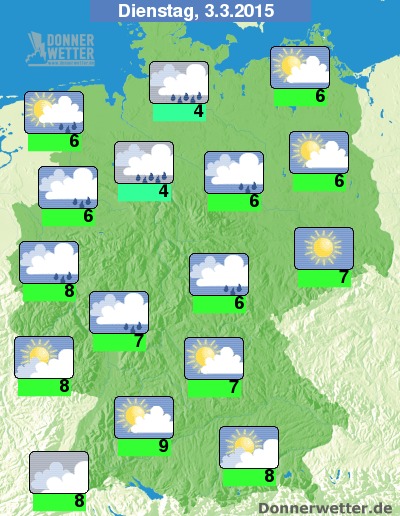 Heute ist es im Osten und Süden des Landes zunächst oft heiter oder aufgelockert bewölkt und trocken. Im Westen ziehen bereits weitgehend dichte Wolken mit teils kräftigem Regen durch. Im Tagesverlauf breiten sich die dichten Regenwolken auch nach Osten und Norden hin aus, im Süden und Südosten bleibt es dagegen bei meist aufgelockerter, teils auch starker Bewölkung weitgehend trocken. Die Höchstwerte erreichen 4 Grad am Rande des Harzes und bis 9 Grad in Stuttgart. Es weht verbreitet frischer und teils auch starker Wind, auf den Bergen und an der See weht der Wind meist stark mit stürmischen Böen.