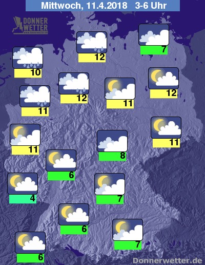 In der folgenden Nacht bilden sich über dem Nordwesten und Norden zeitweise Schauer und hier und da sind einzelne Gewitter möglich. Im übrigen Bundesgebiet ist es hingegen größtenteils nur locker bis aufgelockert bewölkt und auch weitgehend trocken. Die Temperatur sinkt auf 12 Grad in Hannover und bis 4 Grad am Pfälzer Wald.