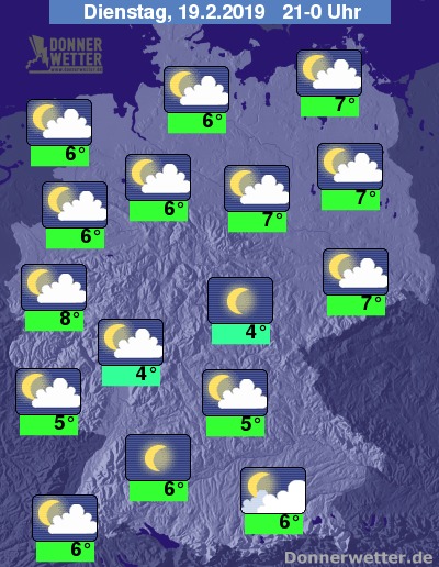 Bis Mitternacht klart der Himmel auch im Osten zum Teil auf und die Temperaturen gehen leicht zurück.