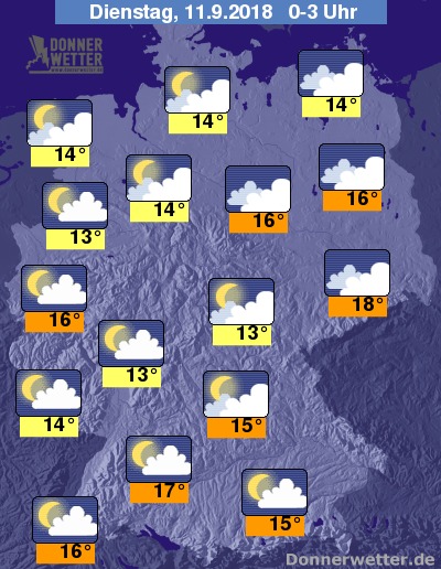 Im Nachtverlauf lockern die Wolken vor allem in der Nordwesthälfte auf, entlang der Oder bleibt der Himmel zumeist bedeckt. Weiterhin lockere Wolken dominieren das Himmelsbild im Süden des Landes. Schauer sind bundesweit nicht zu erwarten.