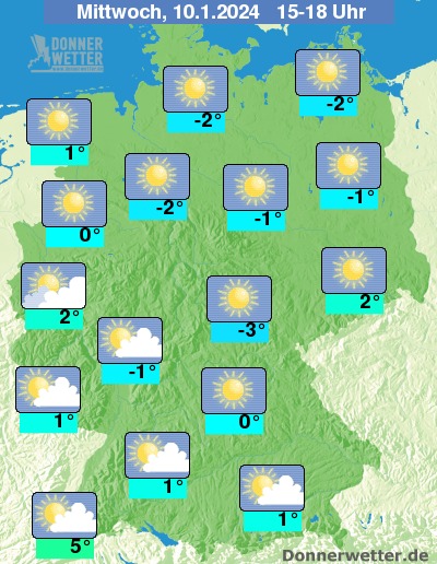 In den Nachmittagsstunden zeigt sich der Himmel über dem Süden und Westen Deutschlands heiter bis wolkig, teils ist es auch aufgelockert bewölkt; in den übrigen Landesteilen scheint die Sonne meist von einem wolkenlosen Himmel. Es bleibt trocken.